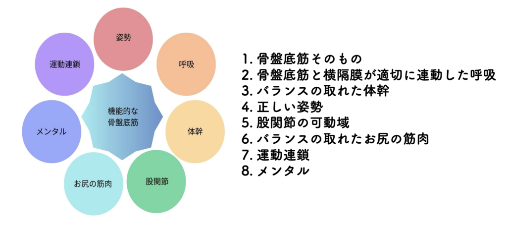 現時点で研究などで明らかになっている骨盤底筋群の機能に影響を与える8つの要素を下に示します。