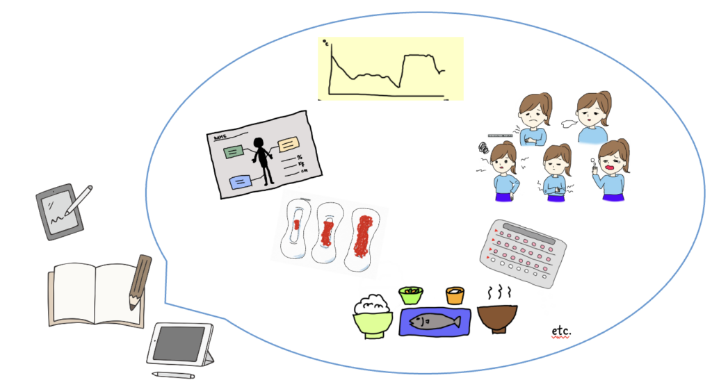基礎体温、体重・体脂肪、経血量、その日の体調(具体的に)、薬を飲んだタイミングなどを記録することで、自分自身の月経周期におけるコンディションの傾向がわかり、対策がとりやすくなります。また、エネルギー不足や月経不順にも気がつくことができ、月経不順で婦人科を受診する場合にも、診断するのに有益な情報になります。記録の仕方は、手帳に記録する、アプリを使用するなど、自分に合ったものを探して記録してみましょう。