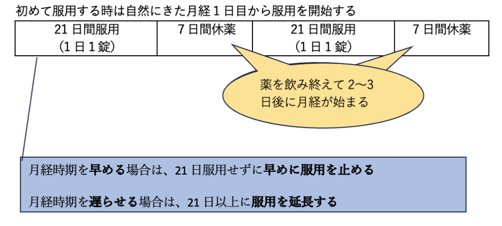 基本的な服用の方法の例:21日間ピルを服用+7日間お休み