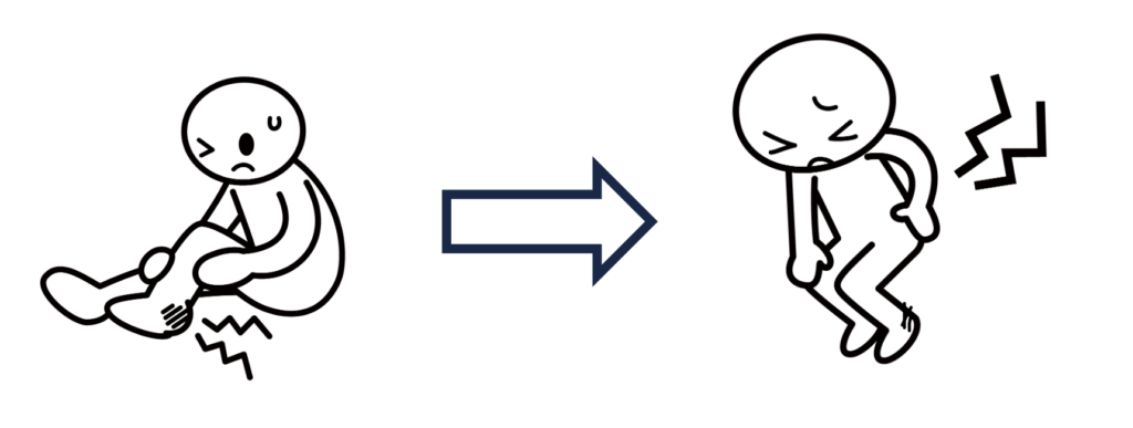 例えば足首の外側を捻挫すると、歩行中に荷重による痛みを避けるため、腰方形筋という骨盤を引き上げる腰の筋肉を使って、足に体重をかけないように腰から足を動かすようになります (捻挫した側の骨盤を挙上して歩く、ヒップハイキングという異常歩行を引き起こします)。