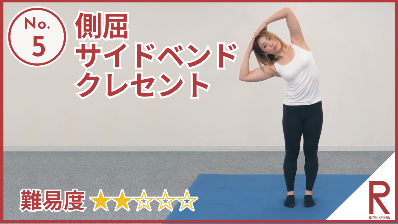 側屈(サイドべンドクレセント) 難易度:★★ 姿勢改善や、体幹の柔軟性や動作の効率性を高めます。動きの中で、自分の身体の軸を安定させながら、呼吸をした際に肋骨が広がり、身体の中にふわっと空気が入ることを体感してみましょう。膝はゆるめないようんい内ももと […] #連動性#体幹部#上半身#骨盤#下半身#体軸#呼吸#姿勢#感覚#胸部#柔軟性