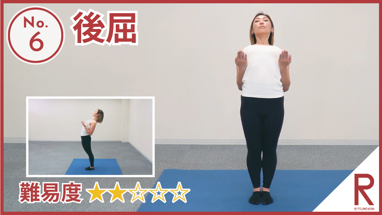 後屈 難易度:★★ 姿勢改善や、体幹の柔軟性や動作の効率性を高めます。息を吸いながらあごを胸に引き寄せ、膝をゆるめないように太もも、骨盤、お腹を少し前に押し出し、一度息を吐いたら、さらに息を吸いながら頭を後ろに落としましょう。 #胸部#柔軟性#連動性#体幹部#上半身#骨盤#下半身#体軸#呼吸#姿勢#感覚