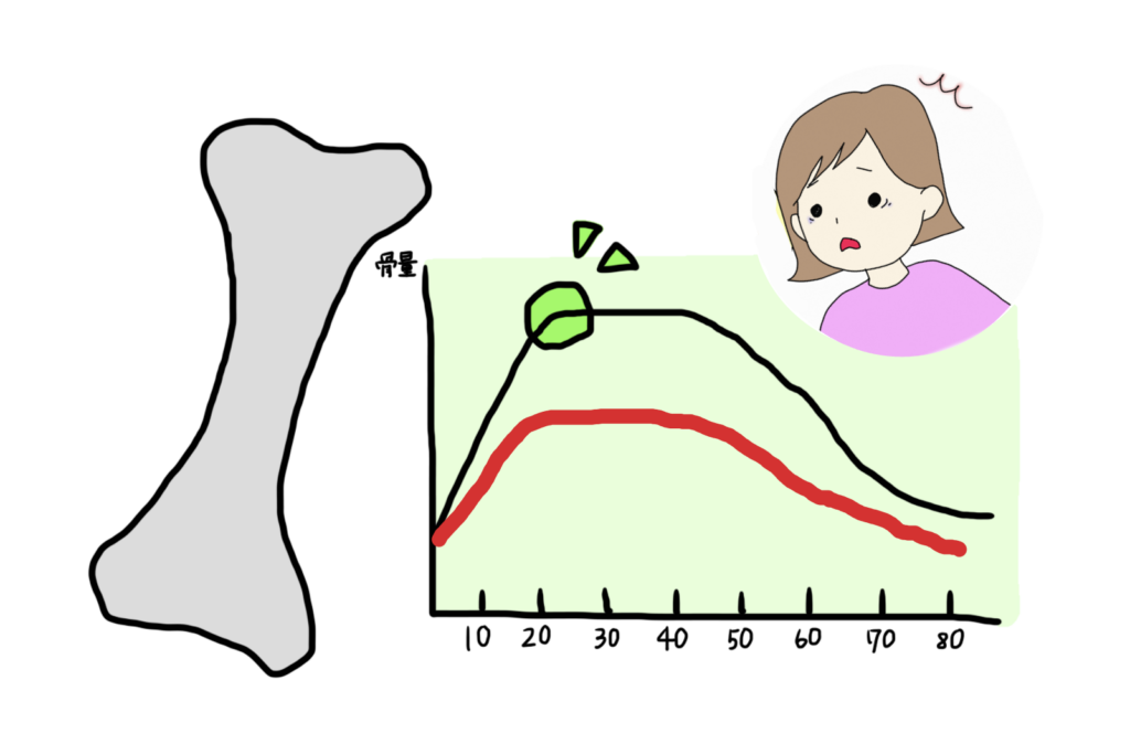 また、骨密度は20代のはじめまでに最大限蓄えられ、その後増えることはありません。そのため、成長期や思春期に無月経になることでエストロゲンが分泌されない時期が続いてしまうと、骨が強くならない/密度が増えなくなり、骨が脆くなる骨粗鬆症を若くして発症し、骨折しやすくなってしまいます。